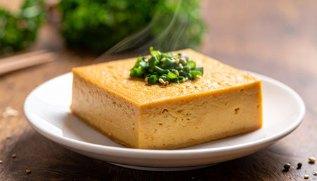 AI Generated. Fresh Tofu Dish with Green Onions and Soy Sauce Glaze Served on a Gray Plate in Natural Light