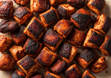 Cubes of rich, dark chicken meat are heavily seasoned and roasted, resulting in caramelized surfaces and dark, charred burnt ends. ideal for barbecue and grilling concepts.