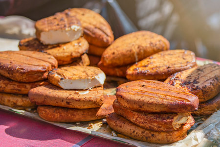 Homemade fried cheese. Homemade cheese fried and smoked in the oven. Cheese on a shelf in a cheese factory.