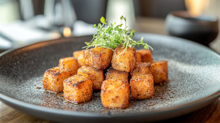 A visually appealing plate of crispy fried cubes garnished with fresh microgreens showcases gourmet dining at its finest, perfect for food lovers.
