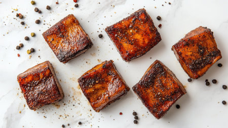 This image shows delicious grilled pork belly cubes arranged on a white marble surface, accented with spices and pepper, ideal for food lovers and chefs.