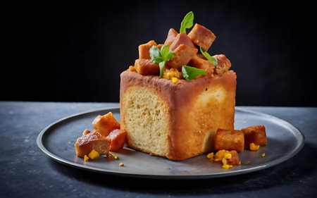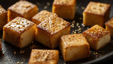Stir Fried Tofu, Healthy Vegan Chinese Food, Diced Fry Tofu Cubes on Dark Background, Abstract Generative AI Illustration