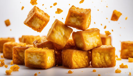 Fried tofu in white plate on white background with flying pieces.