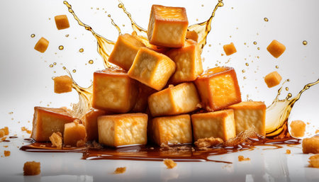 Caramelized cheese cubes with melted caramel on a white background.