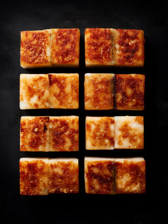 Top-down professional shot of seared radish cake slices arranged in a clean 2x4 grid. Features a deep golden-brown crust and crispy texture against a stark black background.