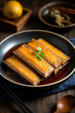 Close up of braised hairtail fish in a bowl