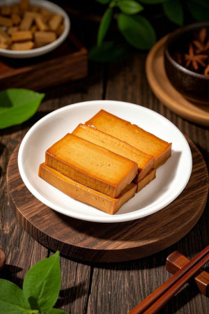 Braised dried tofu delicacy on a wooden plate