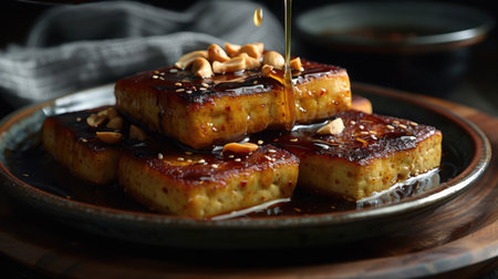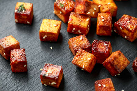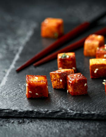 fried tofu with white sesame and teriyaki sauce - vegan and vegetarian food style