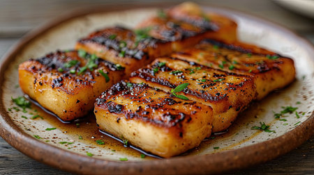 Deliciously charred tofu pieces arranged beautifully with fresh herbs.