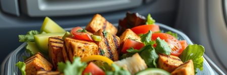 Delicious grilled tofu garnished with fresh herbs served alongside a colorful salad at lunchtime