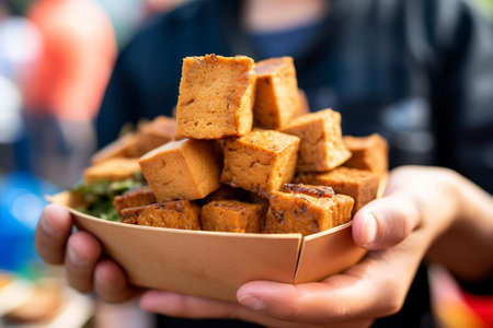 A plate with tofu, in the hand of a girl. Ai generated.