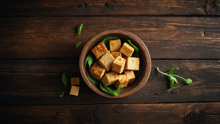 AI Generated. a rustic wood background, showcasing nutritious options like soy-based foods and tofu, ideal for health-conscious individuals seeking plant-based alternatives