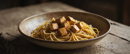 AI Generated. aromatic tofu and pepper spaghetti in a rustic bowl