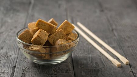 Pieces of fried tofu cheese in a glass bowl on a wooden table. Grilled cheese appetizer.