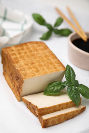 Delicious smoked tofu and basil on tiled table, closeup