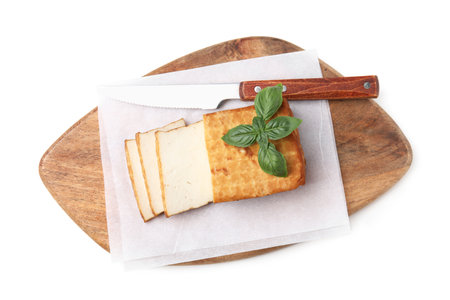 Wooden board with smoked tofu, knife and basil on white background, top view