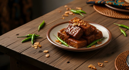 A plate of Tahu Bacem, a traditional Indonesian sweet braised tofu dish, is garnished with crispy fried shallots. Fresh green bird's eye chilies are scattered on the rustic wooden table, enhancing the authentic culinary presentation.