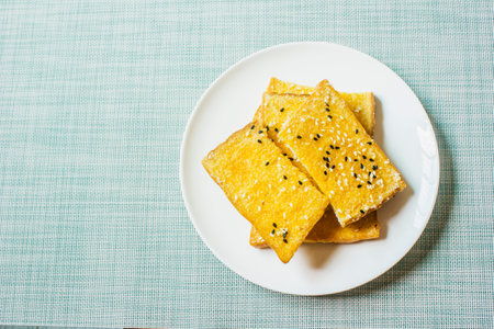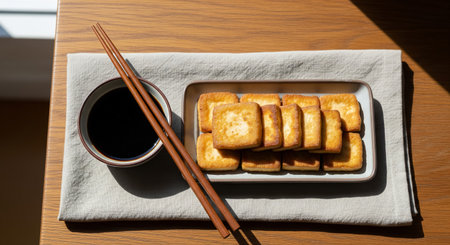 Fried Tofu with chopstick and sesame seeds on rustic stone board