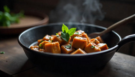 Steaming sweet potato cubes in skillet with herb garnish