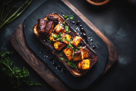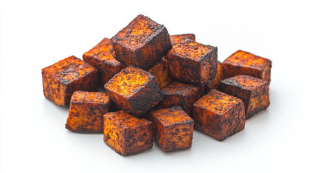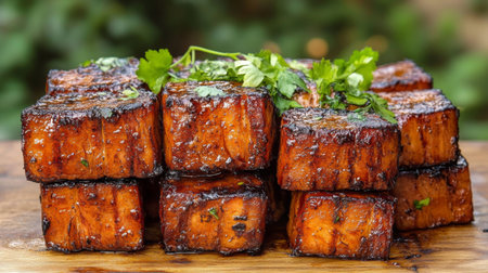A collection of perfectly grilled tofu cubes showcasing a rich smoky char and vibrant flavors, ideal for healthy meals and captivating food photography.