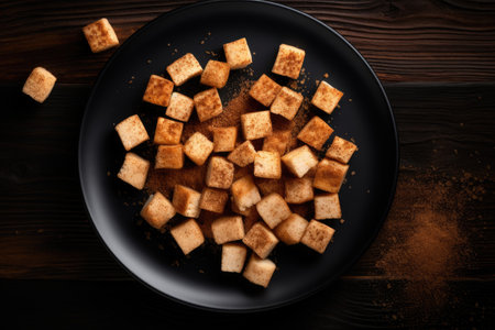 Cinnamon sugar croutons on white square plate top view