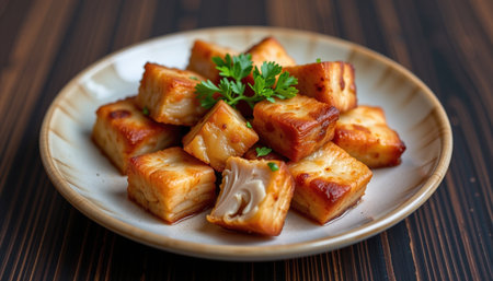 A fried pork belly cubes arranged on plate, garnished with fresh herbs, showcasing crispy texture and golden brown color