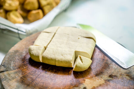 Fresh tofu is placed on a wooden cutting board.