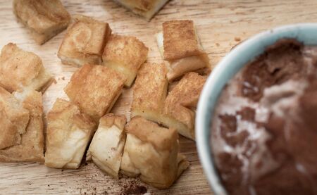 Crispy bread with cocoa ice cream on a wooden plate