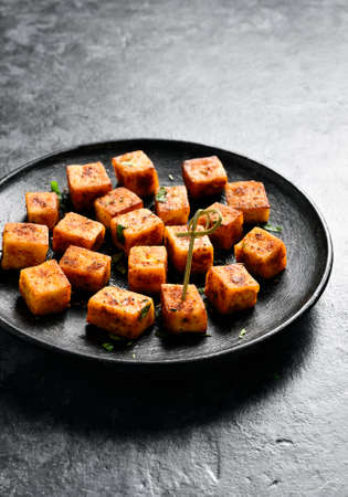 Pan fried paneer. Indian roasted cottage cheese bites on dark stone background with free text space.