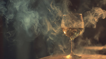Elegant wine glass with mysterious white smoke pouring out, swirling gracefully against a dark moody background, creating a dramatic effect