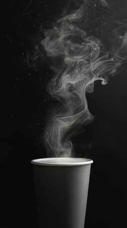 A white cup emits curling steam, suggesting a hot drink inside. The dark background enhances the contrast, emphasizing the soft, swirling shapes of the steam.