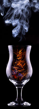 Close-up glass transparent glass filled with a wig from blue, violet smoke smokes and stands on a black isolated background.