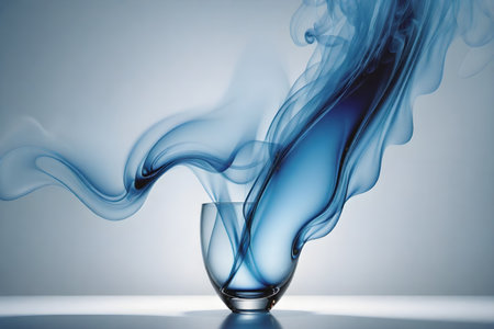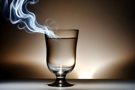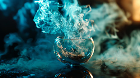 A dramatic scene with mystical smoke rising from a glass, creating an enigmatic and artistic atmosphere in low light.