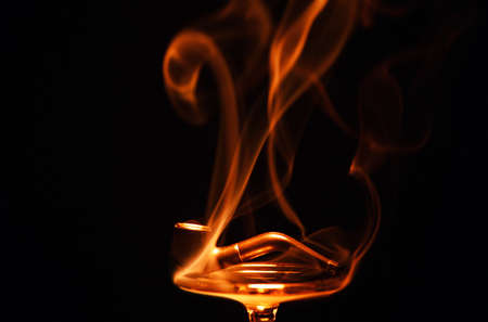 A shot of tequila, vodka or whiskey isolated on black background in the fire flames.
