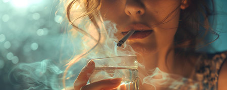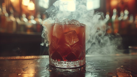 A glass filled with ice cubes with dramatic smoke rising from it, creating a mysterious and atmospheric scene. Ideal for themes of cocktails, drinks, and nightlife.
