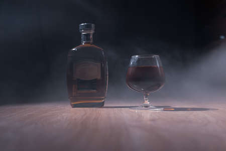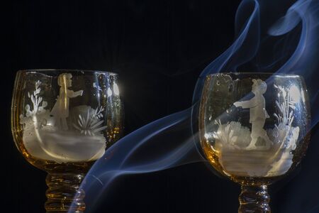 Closeup wine glass with fog at dark background. Beautiful glass with smoke and light. Selective focus
