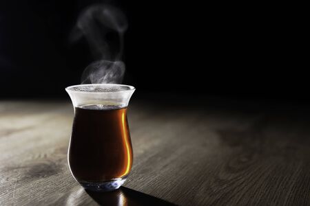 Freshly brewed black tea in a transparent glass Cup,escaping steam, Nature background