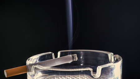 Burning cigarette in glass ashtray. Smoke rising from cigarette in ash-tray.