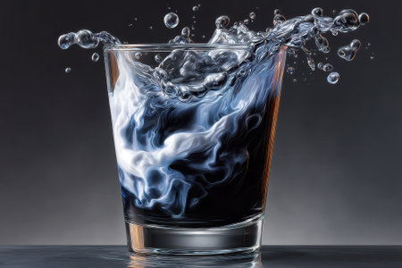 Water swirls dramatically in a glass, showing mesmerizing movements and reflections of light.
