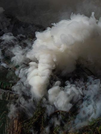 A thick, dense cloud of smoke with a blue tint. The smoke is billowing and swirling, creating a sense of movement and chaos. Scene is dark and ominous