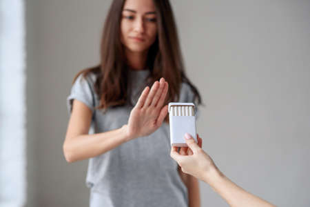 Healthy young beautiful girl refusing to take cigarette from package. Portrait of female showing stop sign with hand to cigarettes. Quit smoking, health care concept.