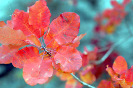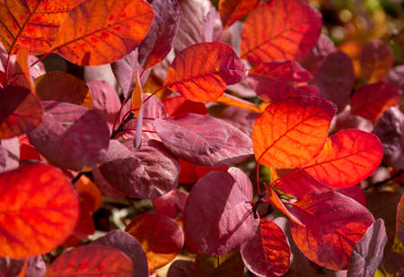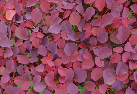 Pubescent branches of a beautiful red Scumpia tree of the sumac family, selective focus. Deciduous tree and shrub Cotinus, close up