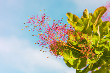 Flowers of blossom pink scumpia in the garden. Summer and spring time