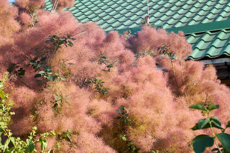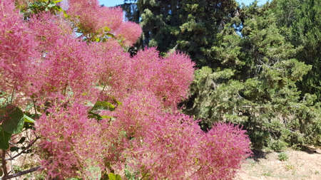 Flowering bush smoke tree of red cotinus coggygria. Beautiful fluffy flowers skumpiya tanning from the anacardiaceae family. Woody deciduous garden plant.