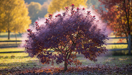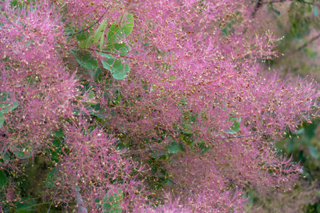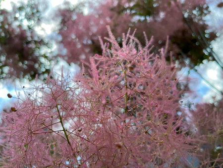 Vibrant pink flowers of the cotinus tree blanket the branches under the warm summer sun.