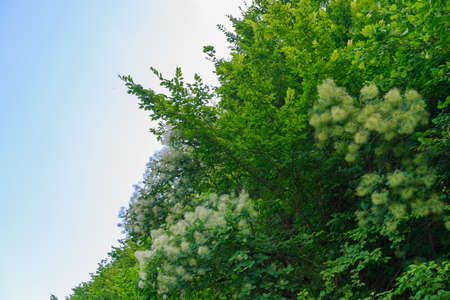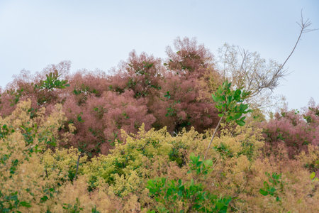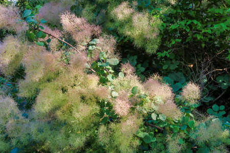 Aaron's-beard or Smoke Bush (Cotinus coggygria) blooms by Black sea. Edificator of thickets of oak-hornbeam forests, typical for Mediterranean. Medicinal plant, bactericidal, antipyretic, orange dye