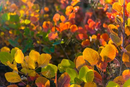 Beautiful autumn nature background with colorful leaves on branch in soft focus. Abstract. Vintage toning