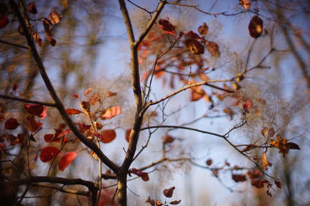 Thin tree with red and brown autumn leaves against the blue sky. Amazing autumnal nature. Art floral card.