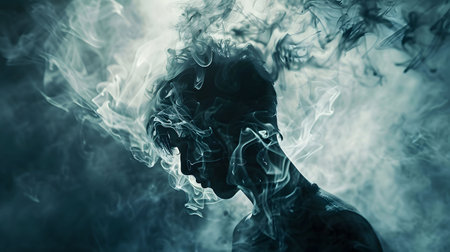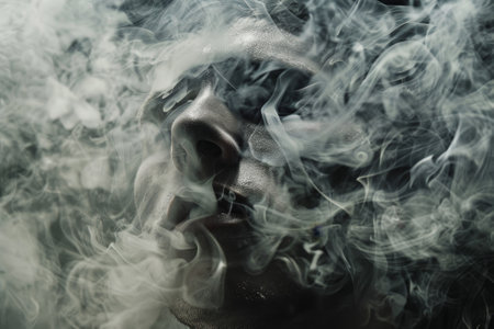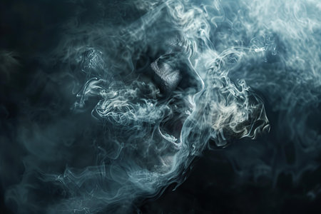 A person's face is obscured by a cloud of smoke. Concept of mystery and unease, as the person's identity is hidden by the smoke. Scene is eerie and unsettling