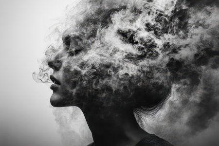 A silhouette of a womans head with smoke billowing out of it against a dark background. The smoke appears to be swirling around her head, creating a dramatic and mysterious visual.
